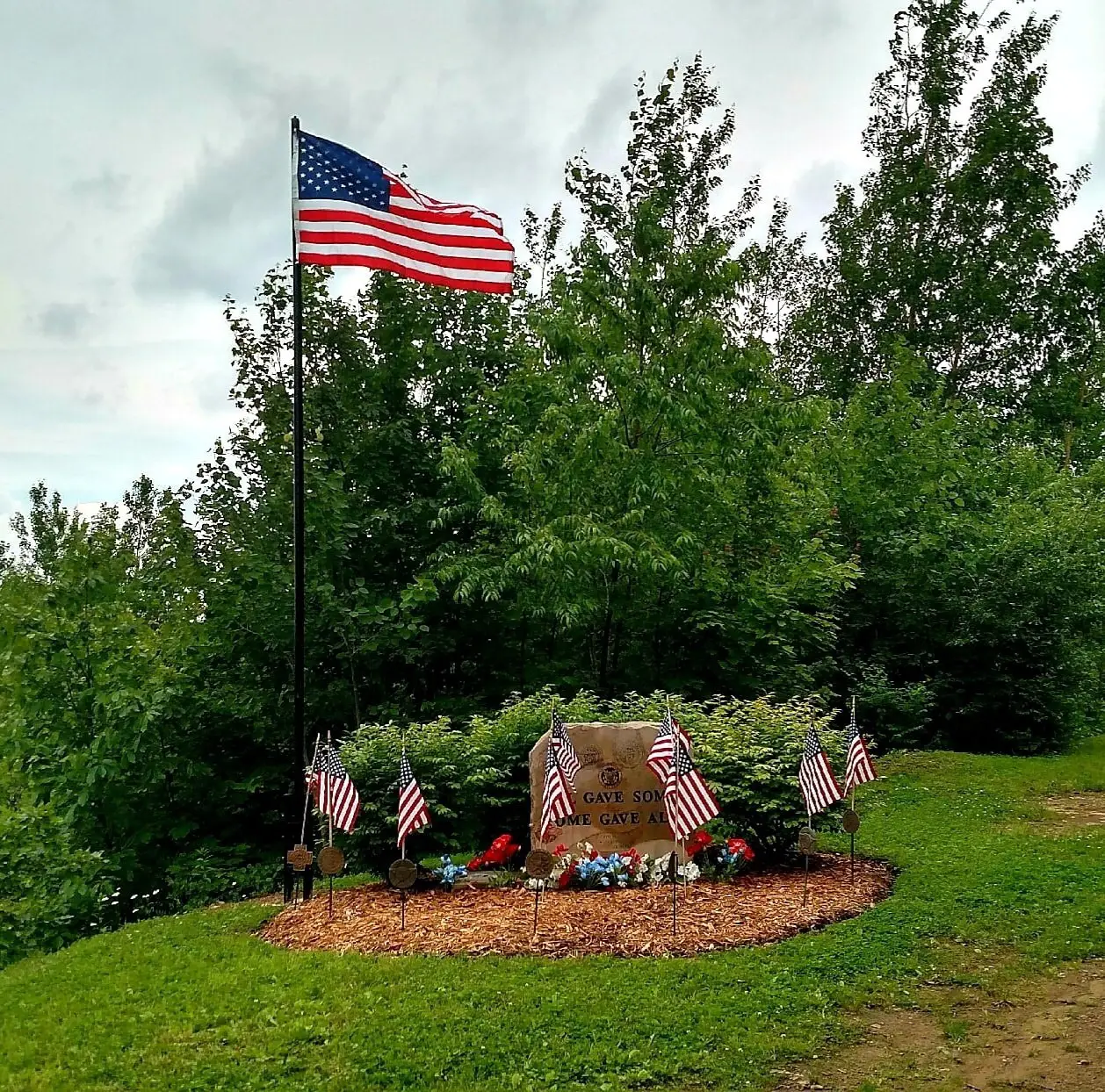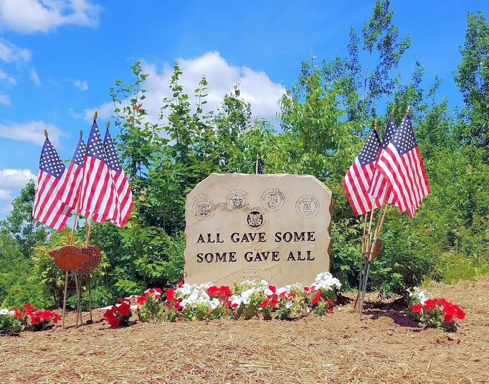 A woman kneels behind a memorial stone honoring fallen soldiers. Man standing between two warning signs in a dry, rural area. A memorial site with American flags and flowers. A small outdoor setup with a wooden structure, picnic table, and greenery. Three piles of gravel with trees in the background under a cloudy sky. Two men constructing a wooden formwork outdoors on a sunny day. Wooden compost bin structure partially built outdoors. Two men assembling a wooden structure outdoors on a sunny day. Man building a wooden structure outdoors on a sunny day. People unloading wooden boards from a tractor in a grassy area. Wooden fence post with a metal bracket secured to the ground. Two men working with a tractor and trailer in a grassy field. Two men loading wooden planks onto a trailer in a gravel area. A rugged off-road vehicle on a grassy path in a rural setting. Three men building a wooden structure outdoors on a sunny day. Workers load wooden beams onto a trailer on a sunny day. 1-4