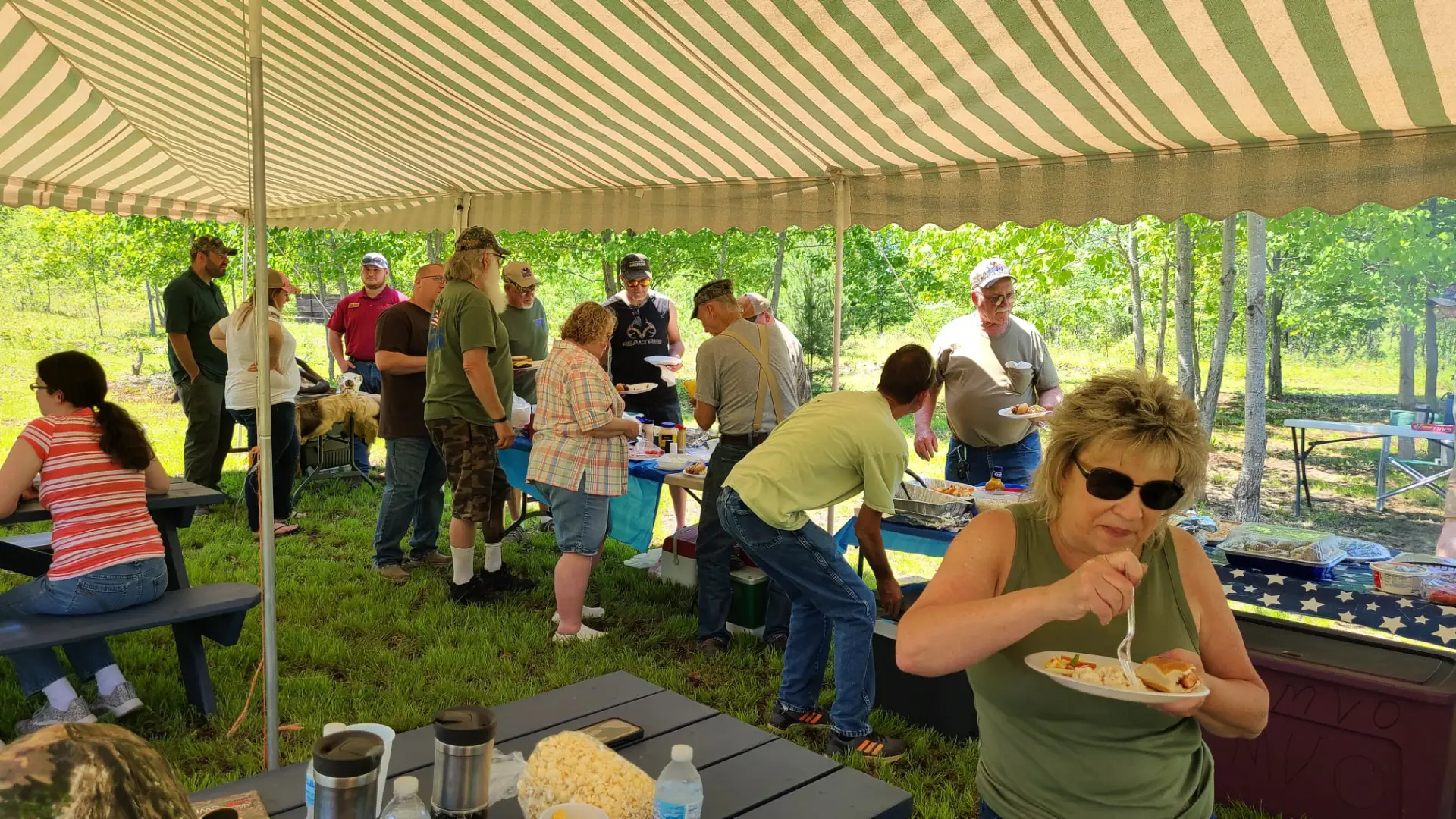 A group of men gathered around a picnic table in a wooded area. Group enjoying a meal outdoors in a wooded area with tall trees. People gathered under a pavilion enjoying a group meal. Three people enjoying a meal together at an outdoor picnic table. Group of people gathered in a pavilion for a casual event. Two men standing behind an outdoor table with various items displayed. People gathered under a wooden pavilion enjoying a social event. People gathered under a wooden pavilion enjoying a daytime event. A table displaying gift baskets and framed pictures outdoors under shade. People gathered under a wooden pavilion, seated at picnic tables. Picnic table with outdoor gear and supplies in a wooded area. A group enjoys a meal under a wooden pavilion surrounded by trees. Group of people in matching shirts smiling at a casual outdoor gathering. Two people grilling outdoors near a tree and cooler. People gathered indoors for a casual meeting or event. Four men gathered around a table outdoors, painting figurines. A group enjoying a meal together at a long outdoor table.