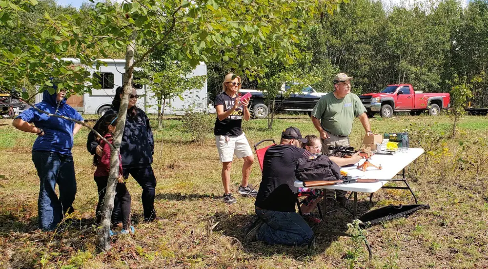 Military Veterans Outdoors Smiling man holding a compound bow outdoors with trees in the background. Military Veterans Outdoors Group portrait of nine people smiling indoors with festive decorations. Man speaking to an audience in a decorated room with string lights. People sitting at a table with a large American flag silhouette artwork. Woman smiling and holding a George Foreman grill box in a gathering. Man proudly showing a tablet with a dog's photo. A group of people gathered around a banquet table in a community hall. Group of people gathered around a table in a banquet hall. Man smiling and holding a packaged item in a casual indoor setting. Two men filling a large white tank on a truck bed using a pink bucket. People carrying buckets outdoors, possibly collecting or harvesting. Group of people gathered around a car in a forested area. Woman wearing a mask leans on a car in a wooded area with other cars lined up. A group of men conversing in a forest clearing during a casual outing. Four people stand outdoors near a vehicle, holding buckets and engaging in conversation. People collecting water from a natural spring in buckets. People loading equipment into a pickup truck outdoors. A person collects water from a shallow stream using a bucket. Three men standing and talking in a wooded area during the day. Child scooping water from a creek with a bucket. Person in a yellow jacket walking along a riverbank with a bucket. Two boys holding buckets, standing by a shallow stream. Two men standing outdoors near a tree and buckets on the grass. Two people crouching by a water body, inspecting something. Person collecting water from a stream using a bucket. Two people releasing fish into a river from buckets. Person collecting water from a stream in a plastic bag. Two people holding white buckets in a forested area. Person washing or rinsing a white container in a shallow river. Group of people holding buckets in a forest clearing. A group of smiling kids outdoors holding white buckets in a green wooded area. Group of young people outdoors with buckets and shovels. Group of people outdoors holding buckets, posing for a photo under a tree. Two men standing in a gun shop with rifles displayed behind them. Two people sitting at a table in a cozy, rustic room with wooden shelves. Person aiming a handgun at an indoor shooting range. An elderly man aiming at a target in an indoor shooting range. Man aiming a handgun at an indoor shooting range. Two people aiming rifles at a shooting range. Person in camouflage aiming a rifle at a shooting range.